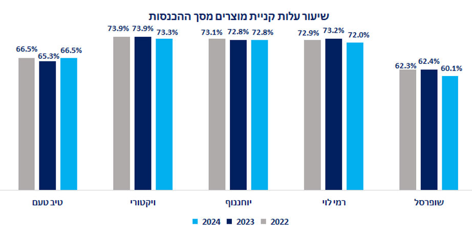בתקופה שבה יוקר המחיה פחות נוכח בשיח הציבורי, הרשתות מצליחות לתרגם עליות מחירים של הספקים לשיפור/לשימור הרווחיות הגולמית. ניתן לבחון את הטענה באמצעות שיעור עלות הקניות מסך