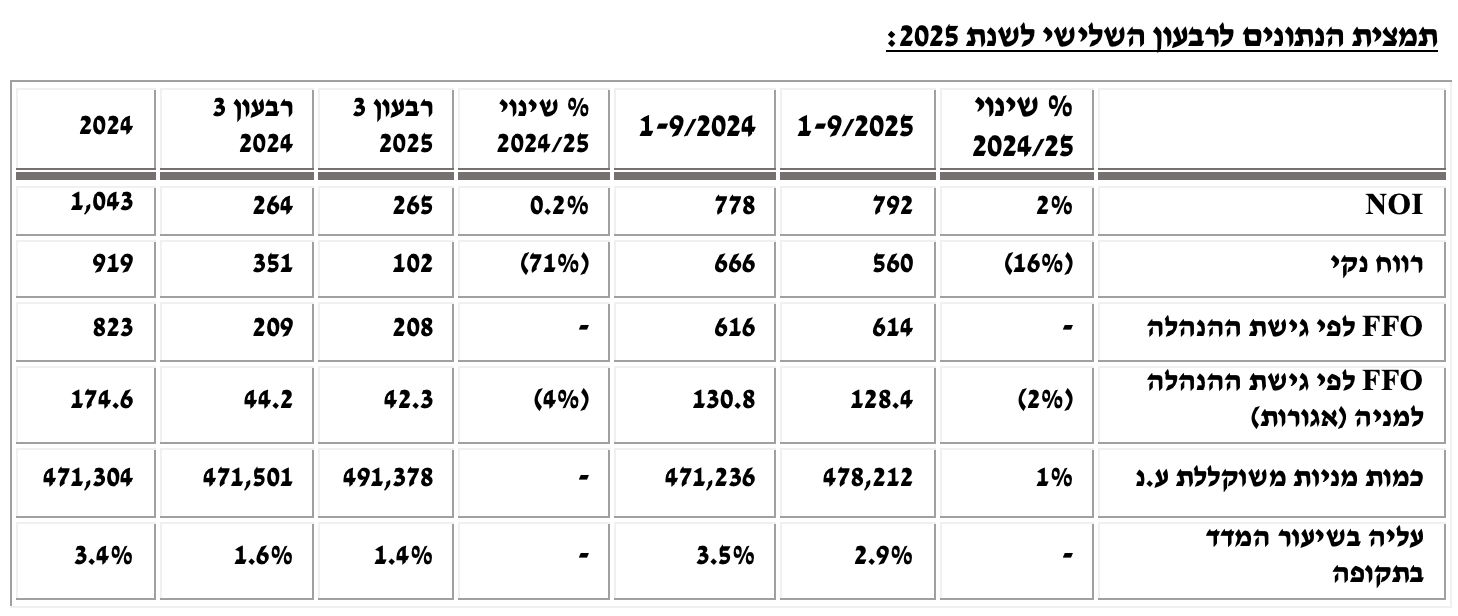 עם פרסום הדוחות עדכנה החברה את תחזיותיה לשנת 2025 כולה והיא צופה כעת כי ה-NOI השנתי יסתכם בטווח שבין 1.05-1.07 מיליארד שקל וה-FFO יעמוד בטווח שבין 810-830 מיליון שקל, כמעט ללא שינוי מהתחזיות הקודמות.